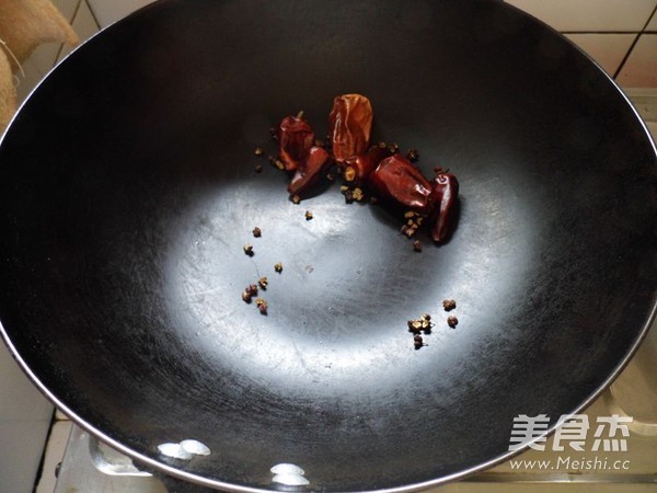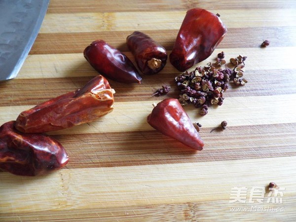 5、炒鍋下入干花椒和干辣椒小火培香成棕紅色后,撈出剁碎備用,不需要太碎