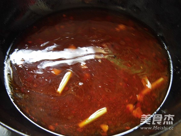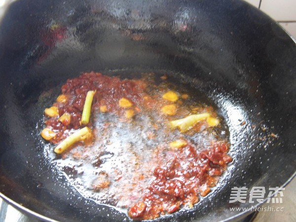 7、炒鍋放入2湯匙菜籽油加入豆瓣醬、姜末、蔥段炒出紅油