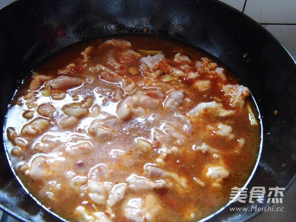 11、再加入腌制好的肉片劃散,煮到肉片變白,煮的時間不要太長,以免肉片的口感太老