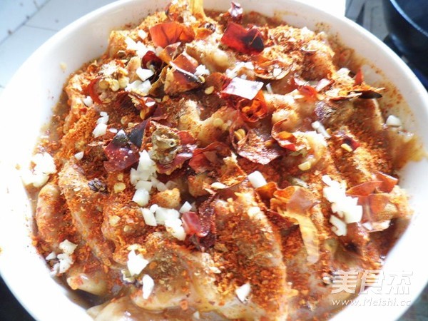 12、將煮好的肉片倒入容器里,將剁碎的花椒、辣椒碎、辣椒粉、花椒粉、蒜末撒在肉片上